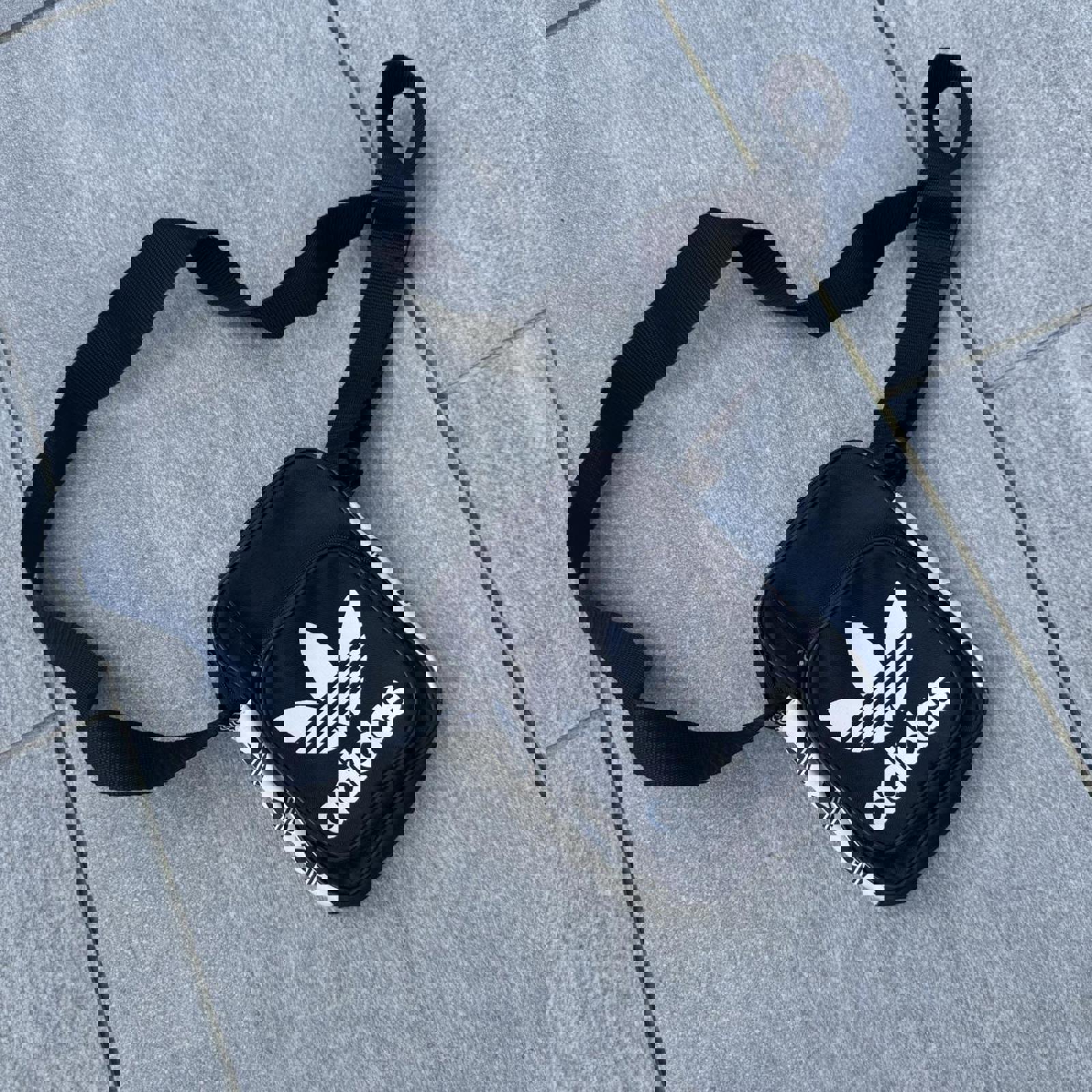 adidas accessories, trefoil logo, sporty bag, streetwear, compact crossbody, black and white, logo print, adjustable strap, zip closure, casual style