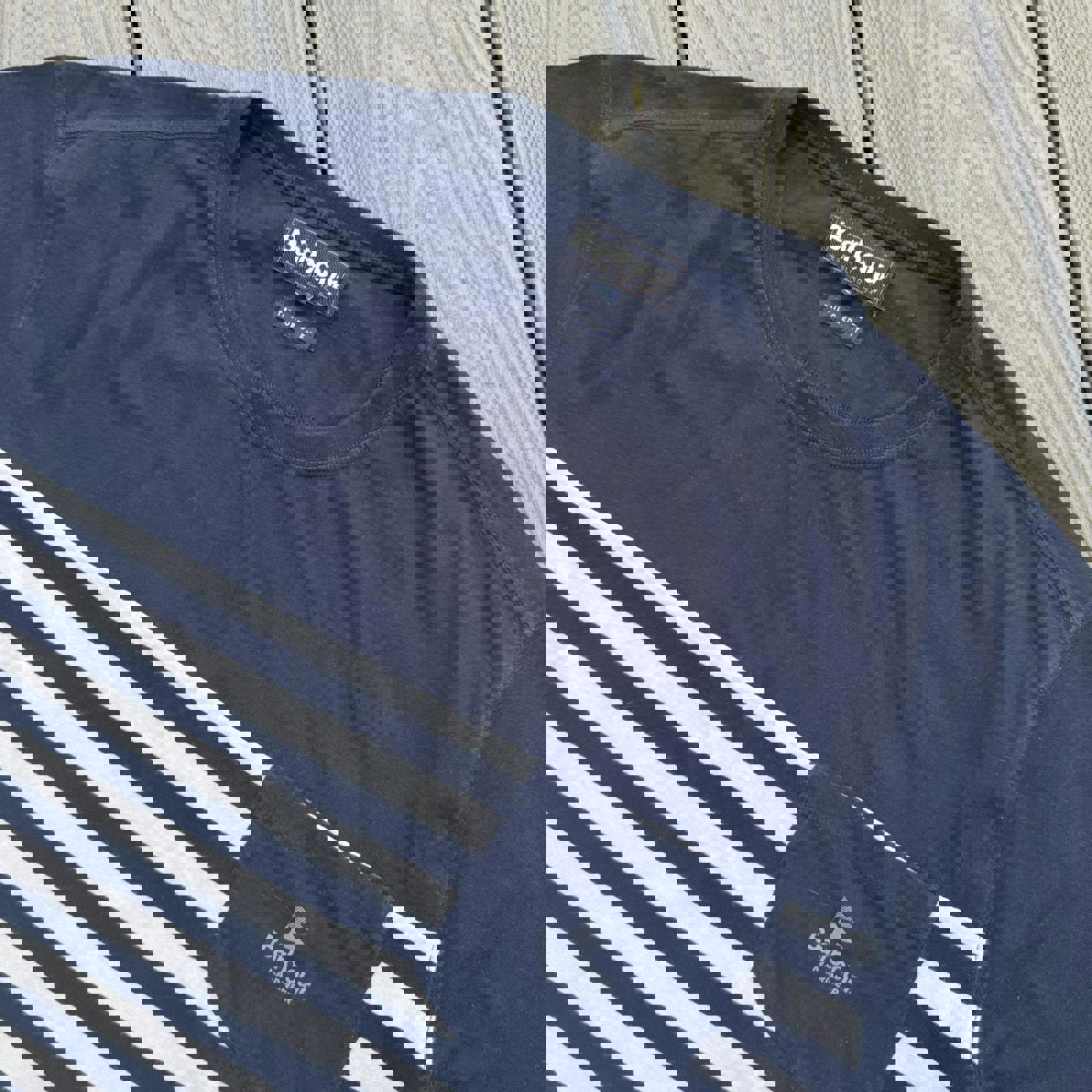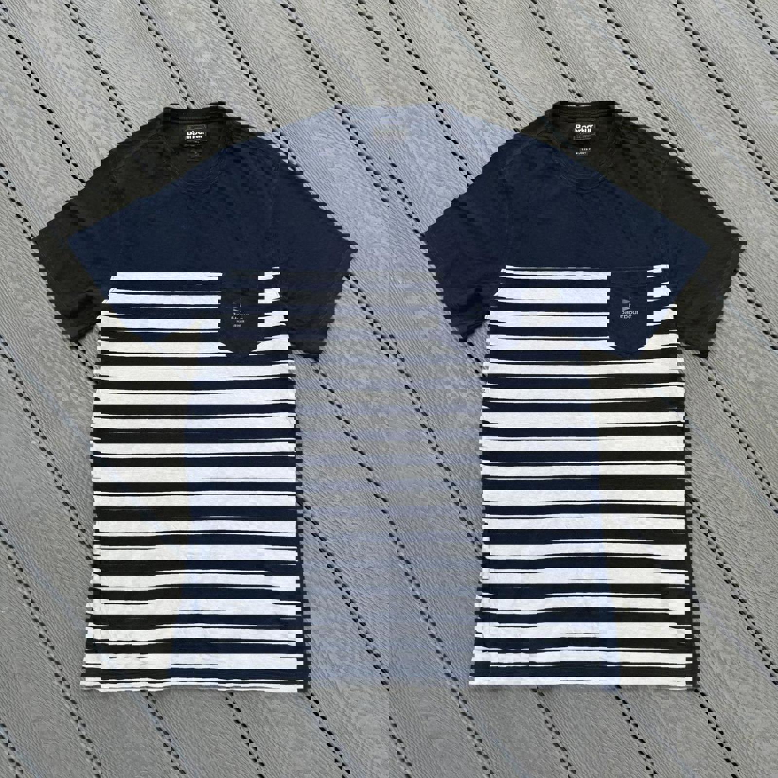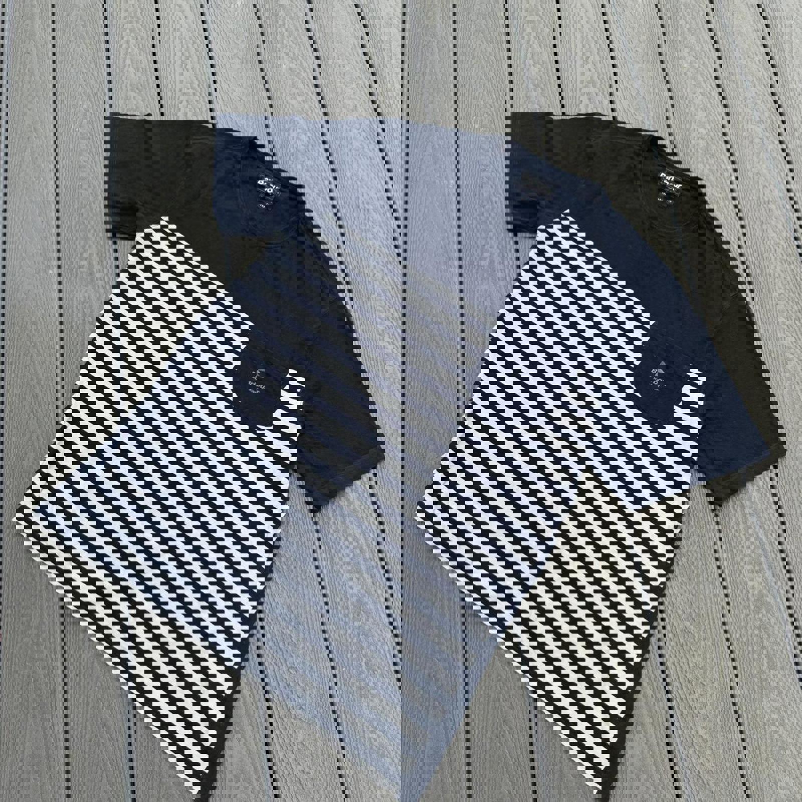 Heritage Barbour piece with a nautical edge. Navy with bold white stripes and pocket logo detail, cut in a tailored fit. A clean everyday staple with premium build — ideal for smarter casual styling or layered summer looks.