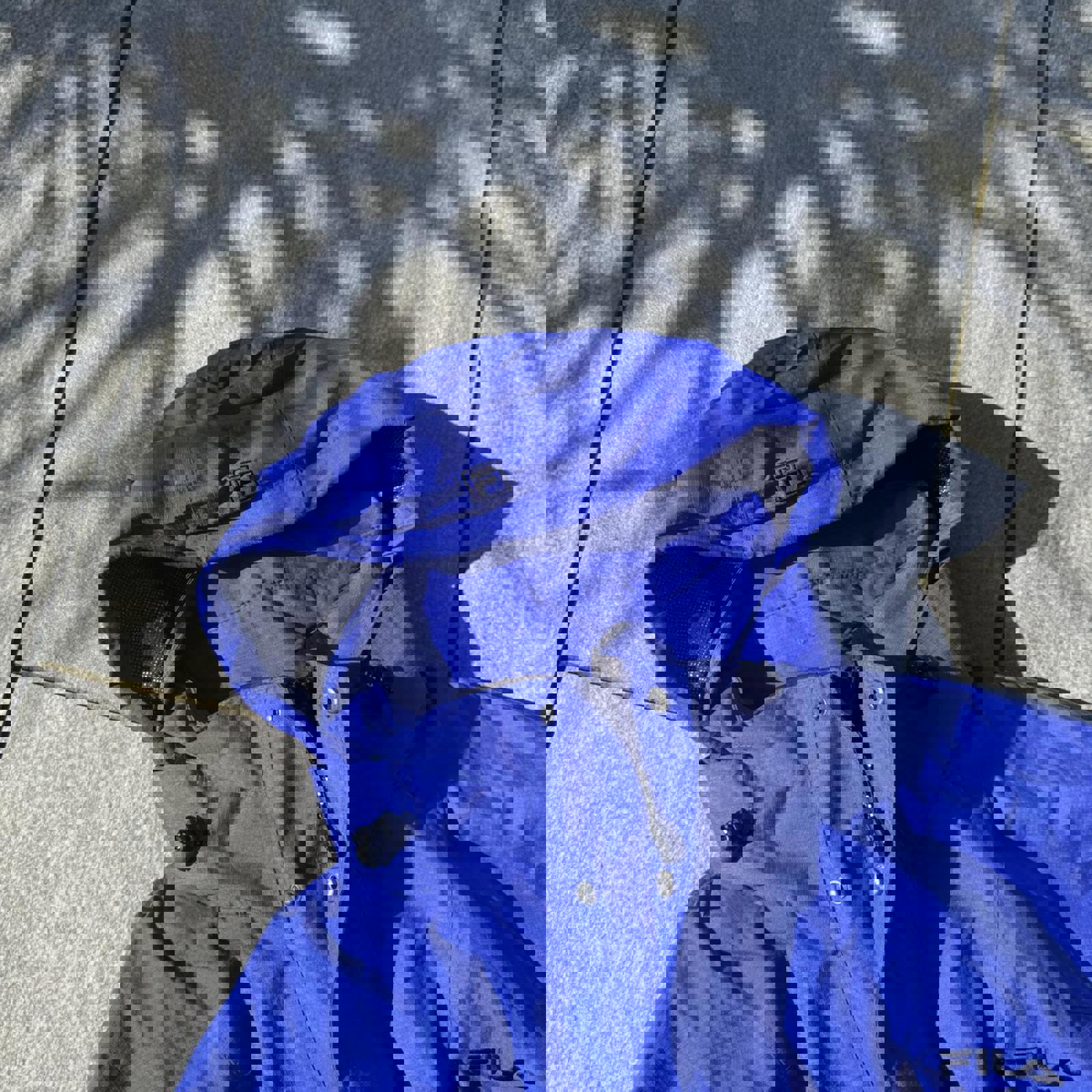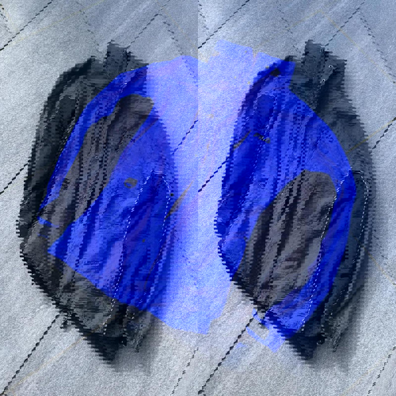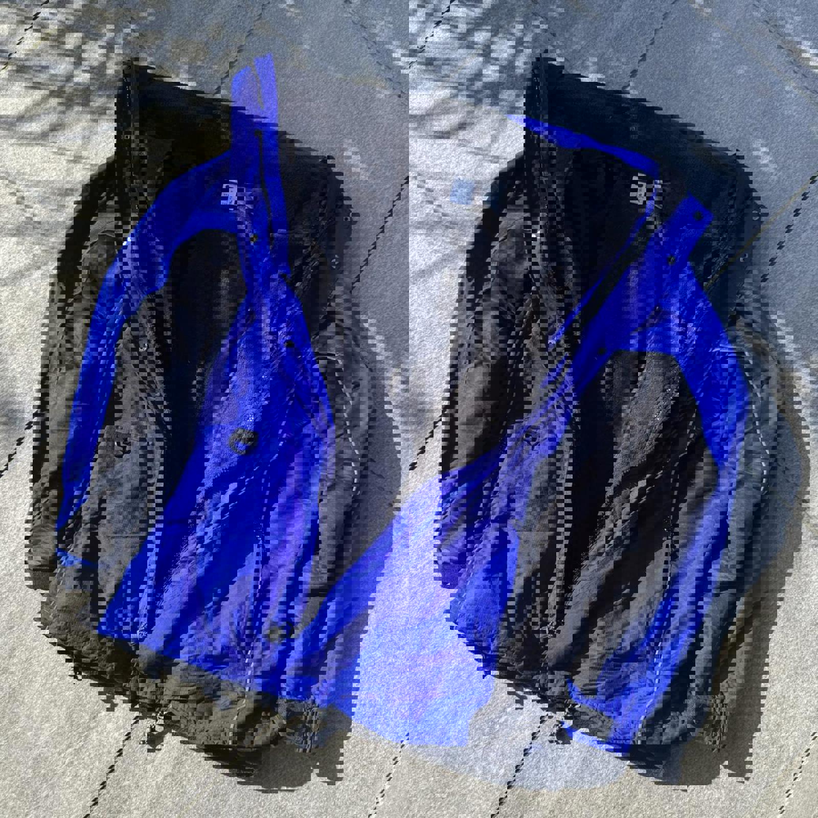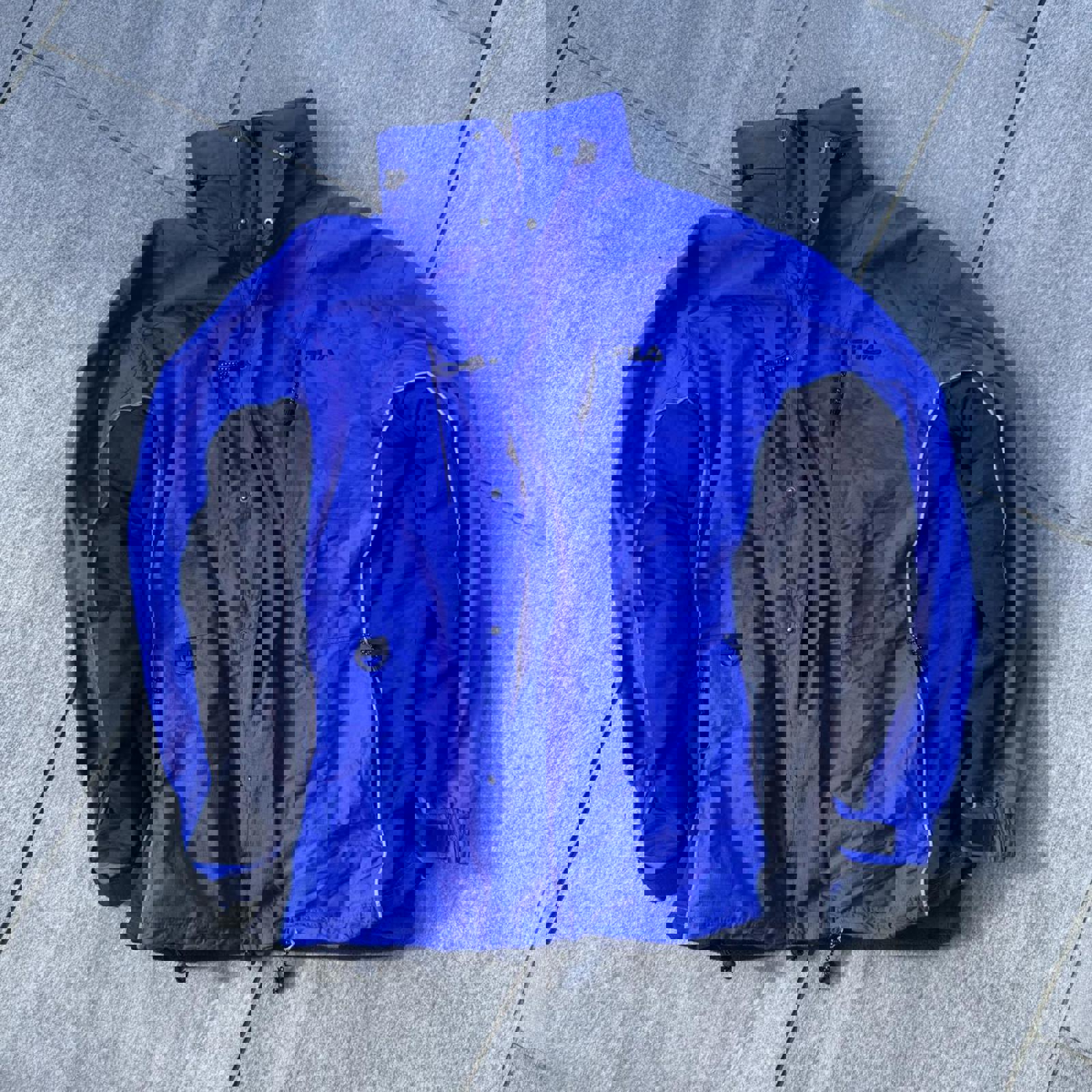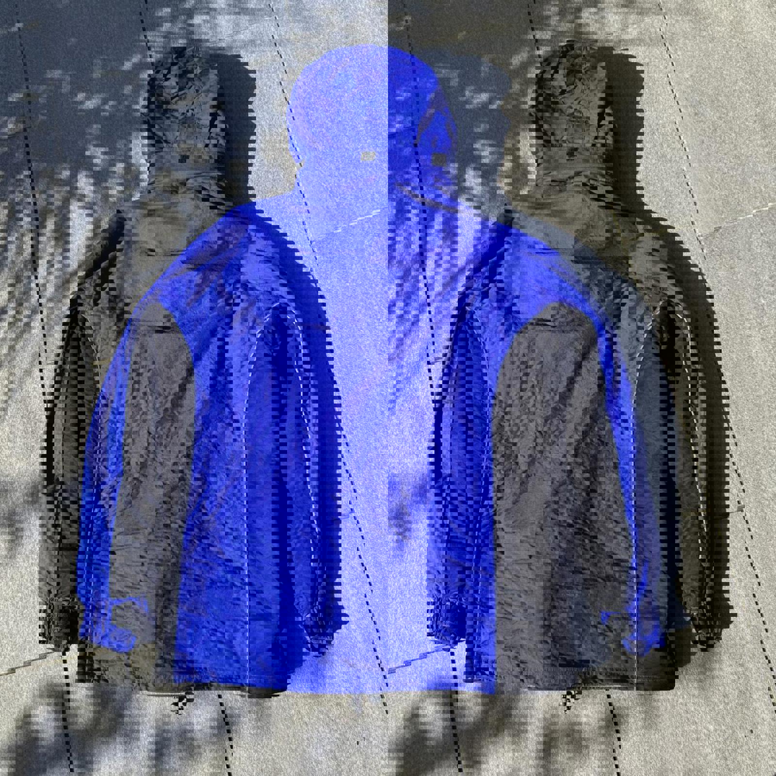 electric blue, black contrast, technical jacket, retro sportswear, hooded utility, zipped front, snap closure, detachable fleece, embroidered logos, vintage raincoat