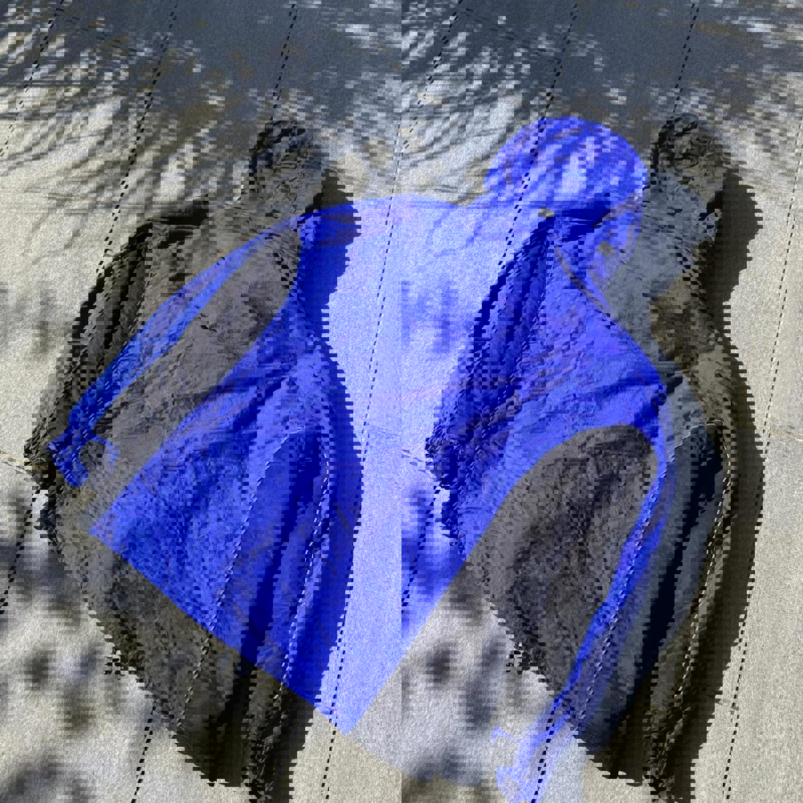 Retro Fila outerwear piece in electric blue with black contrast panels. Features full zip + snap button closure, adjustable hem + cuffs, hidden hood with logo detail, and detachable black fleece lining for versatility. Embroidered Fila logos on outer + fleece. Proper old-school sportswear look with utility vibes.