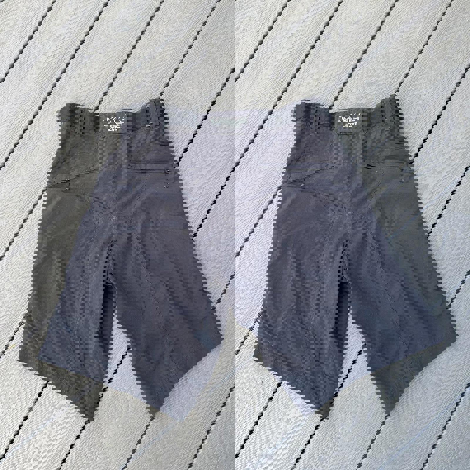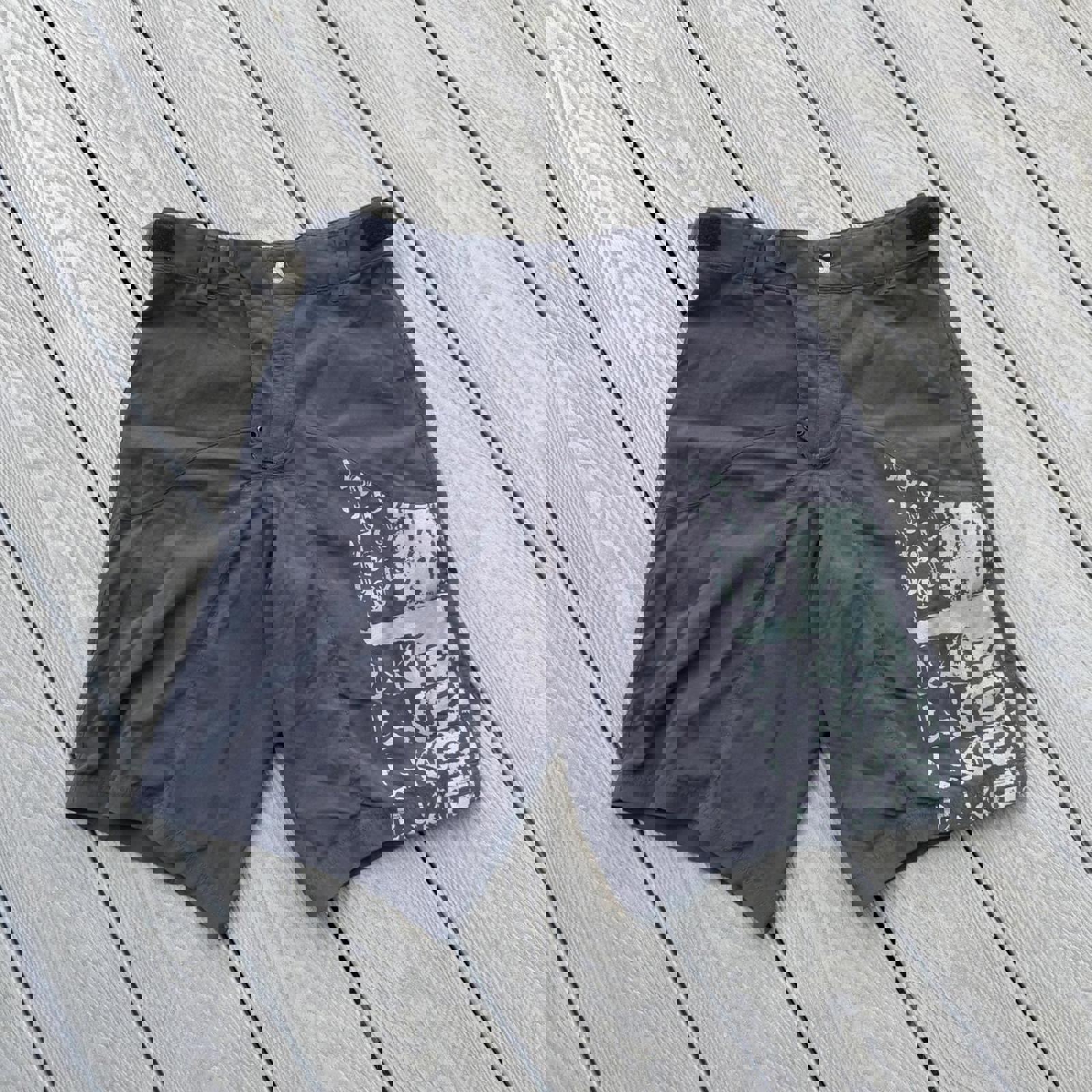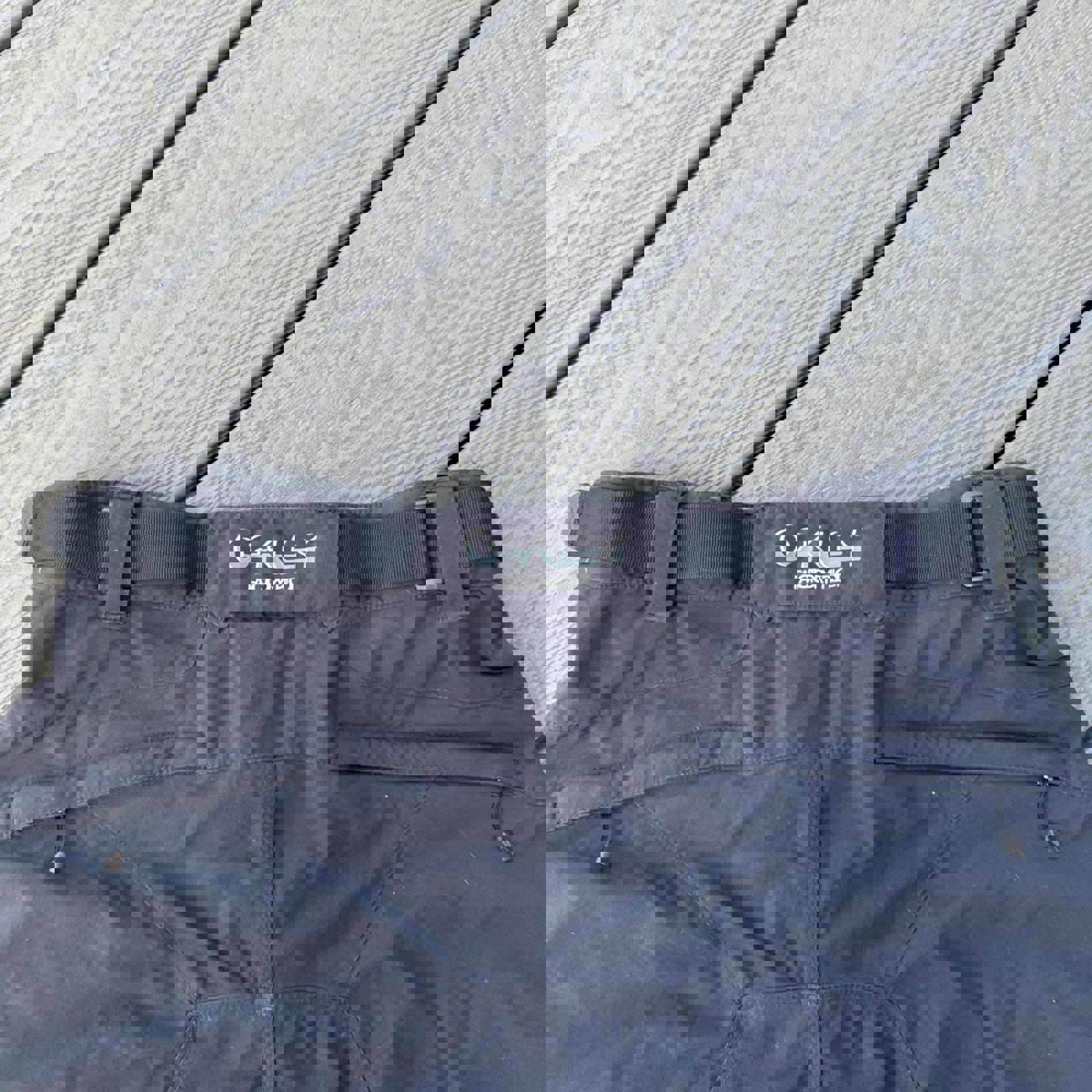 Black Oakley shorts with side graphic print, velcro waist adjusters, zip + button closure, back zip pockets, and Factory Pilot branding on the rear waistband. Lightweight technical design with a streetwear edge.