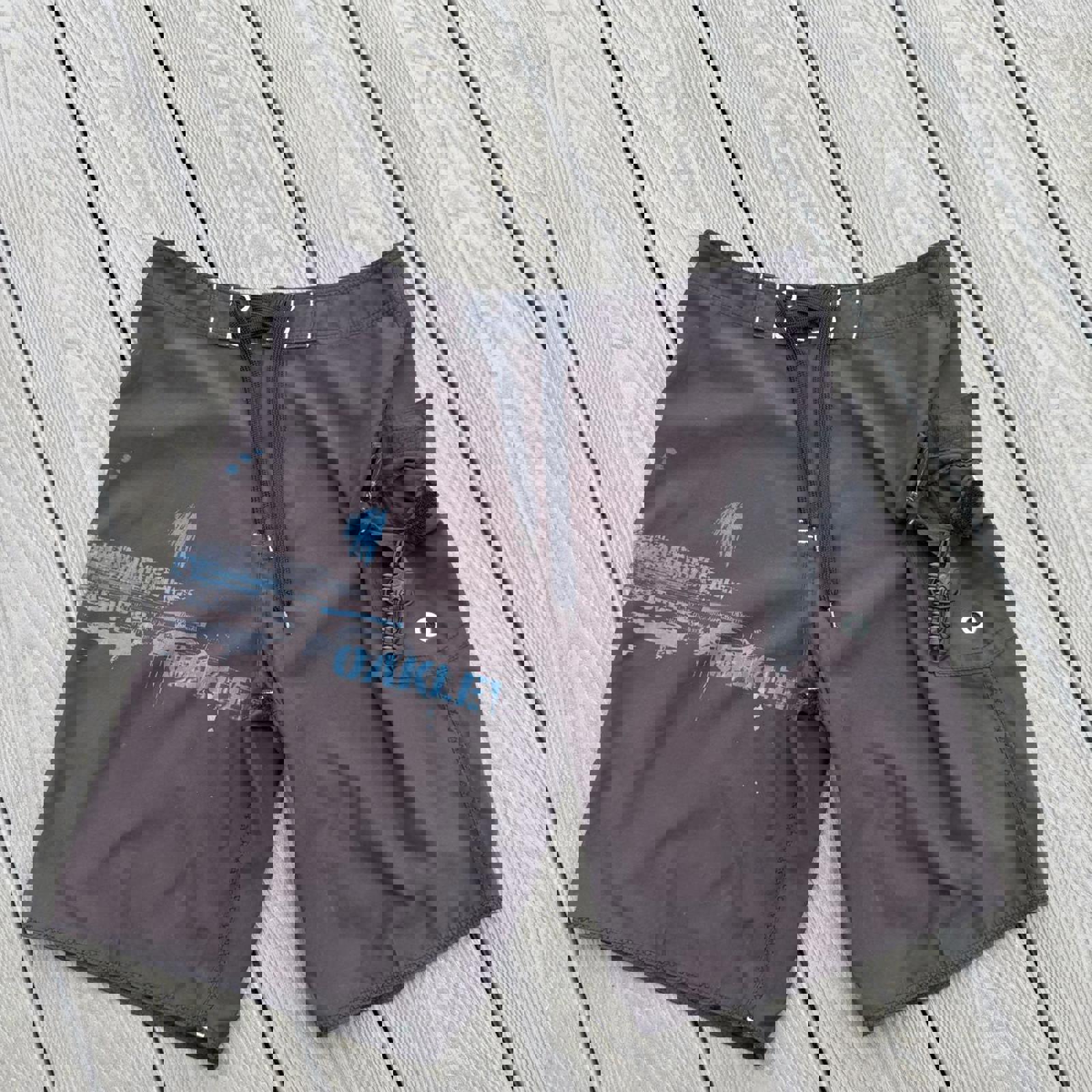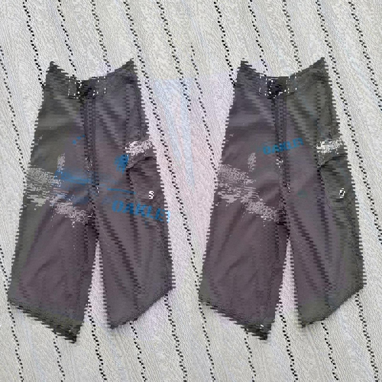 Retro Oakley board shorts featuring bold blue abstract paint-style graphics and Oakley logo hits on front and back. Built-in side cargo pocket with secure Velcro closure and original Oakley surf tool attachment. Durable, lightweight fabric – ideal for summer, skate, or streetwear styling.