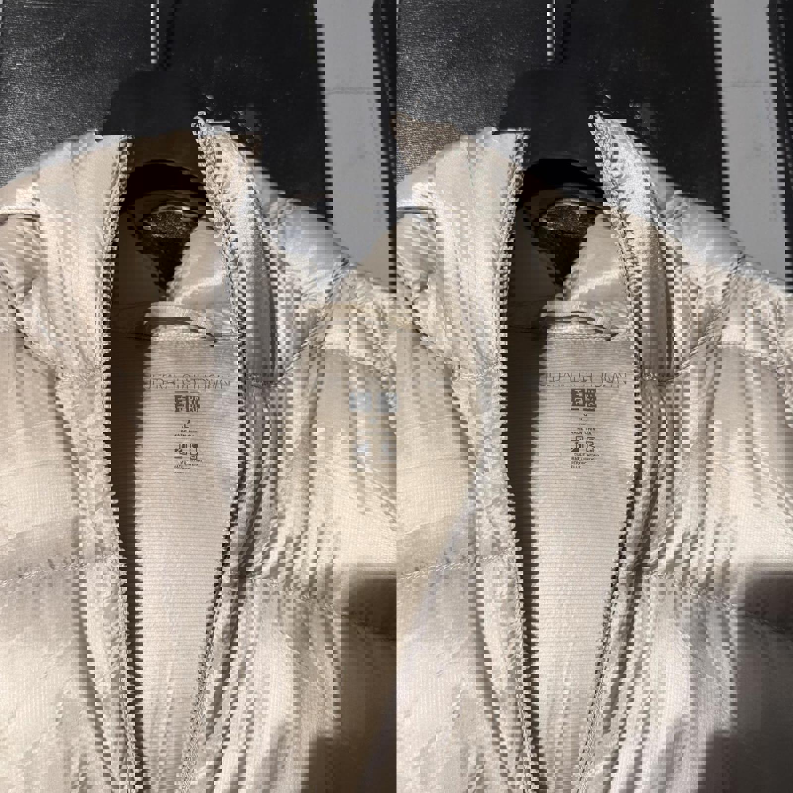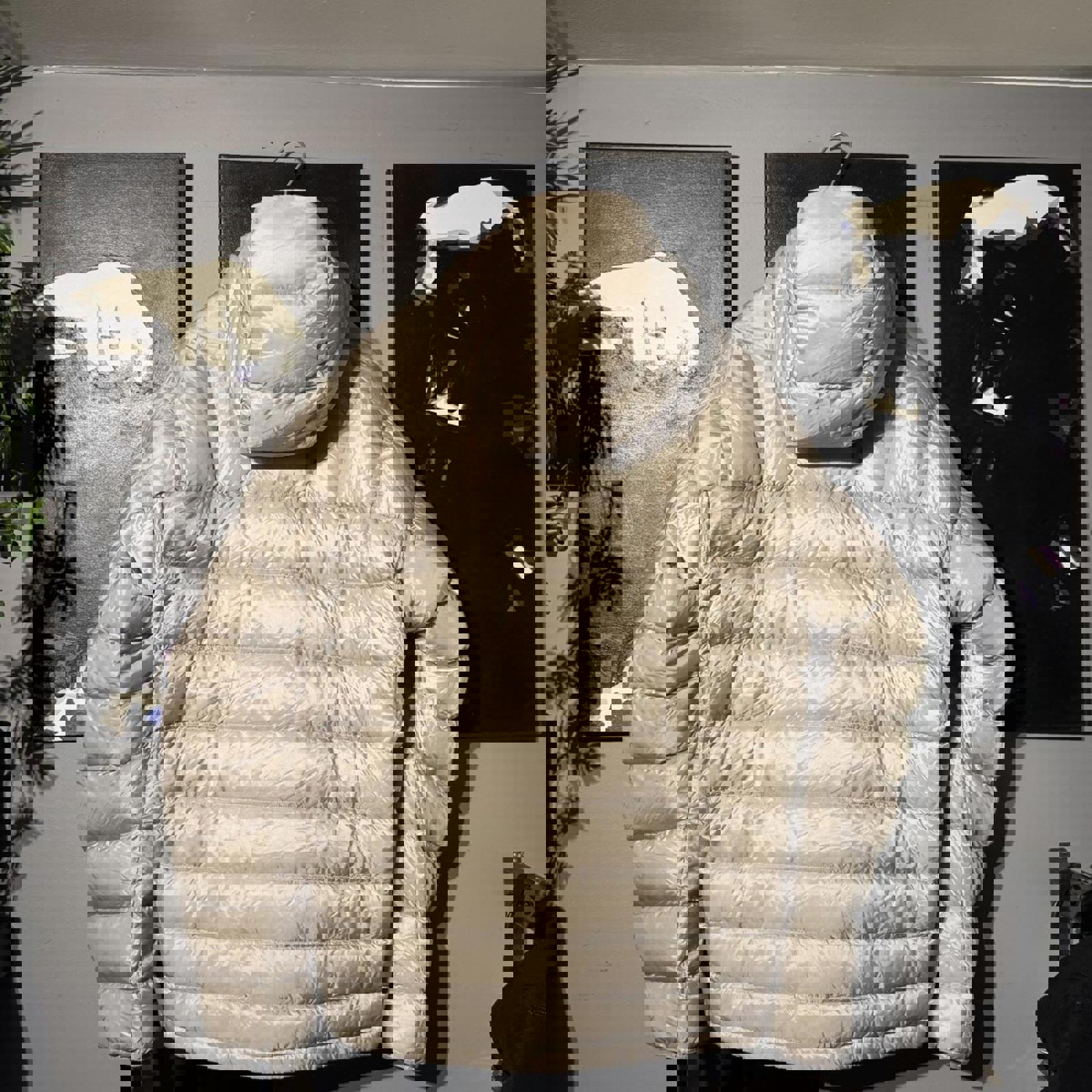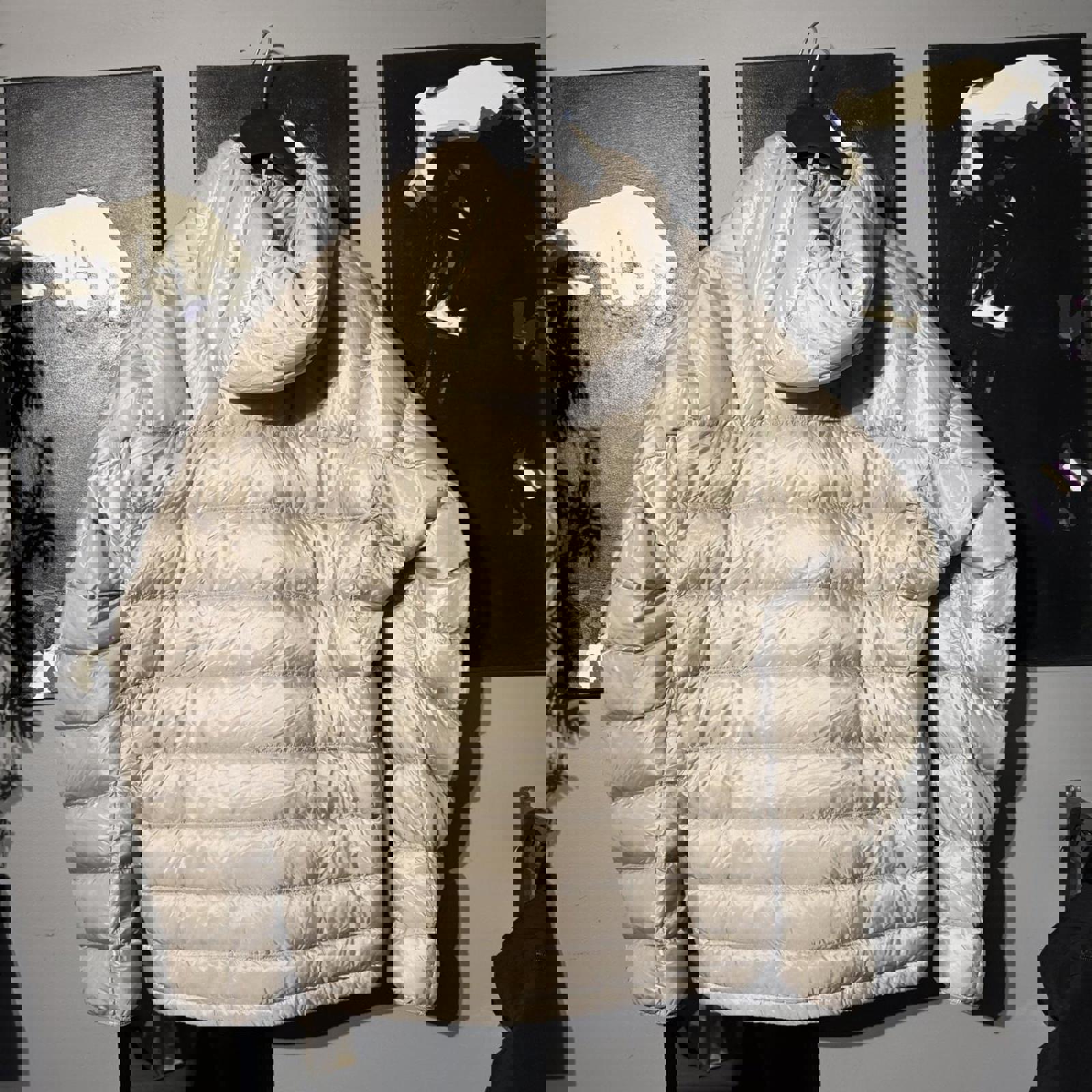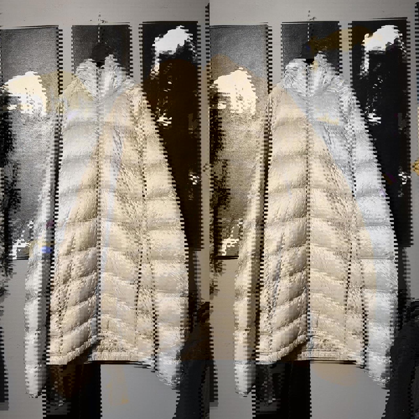 beige down jacket, packable outerwear, insulated puffer, lightweight coat, ultra warm fill, minimal branding, casual winter, winter layering, neutral tone, insulated zip jacket