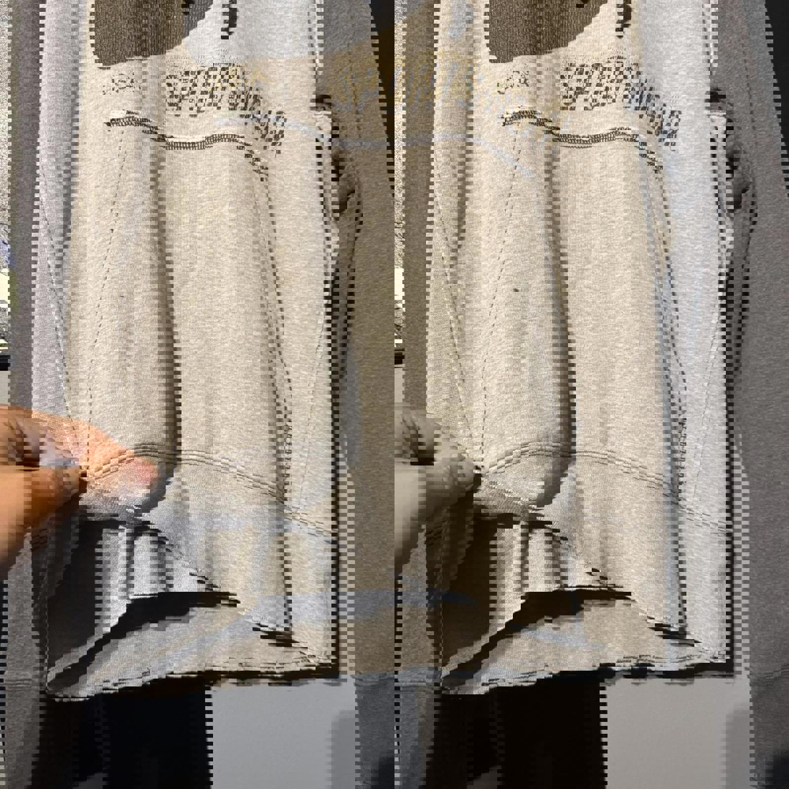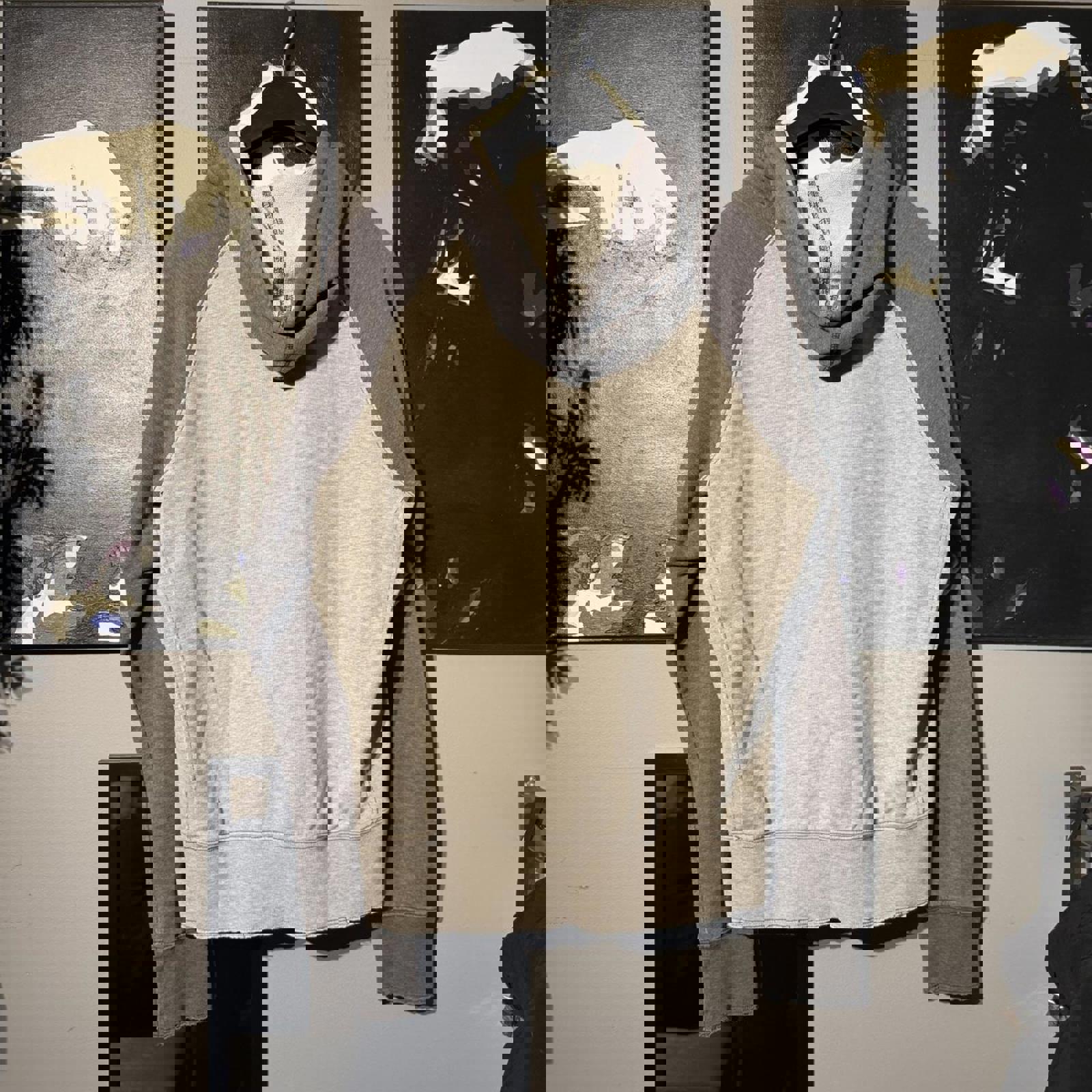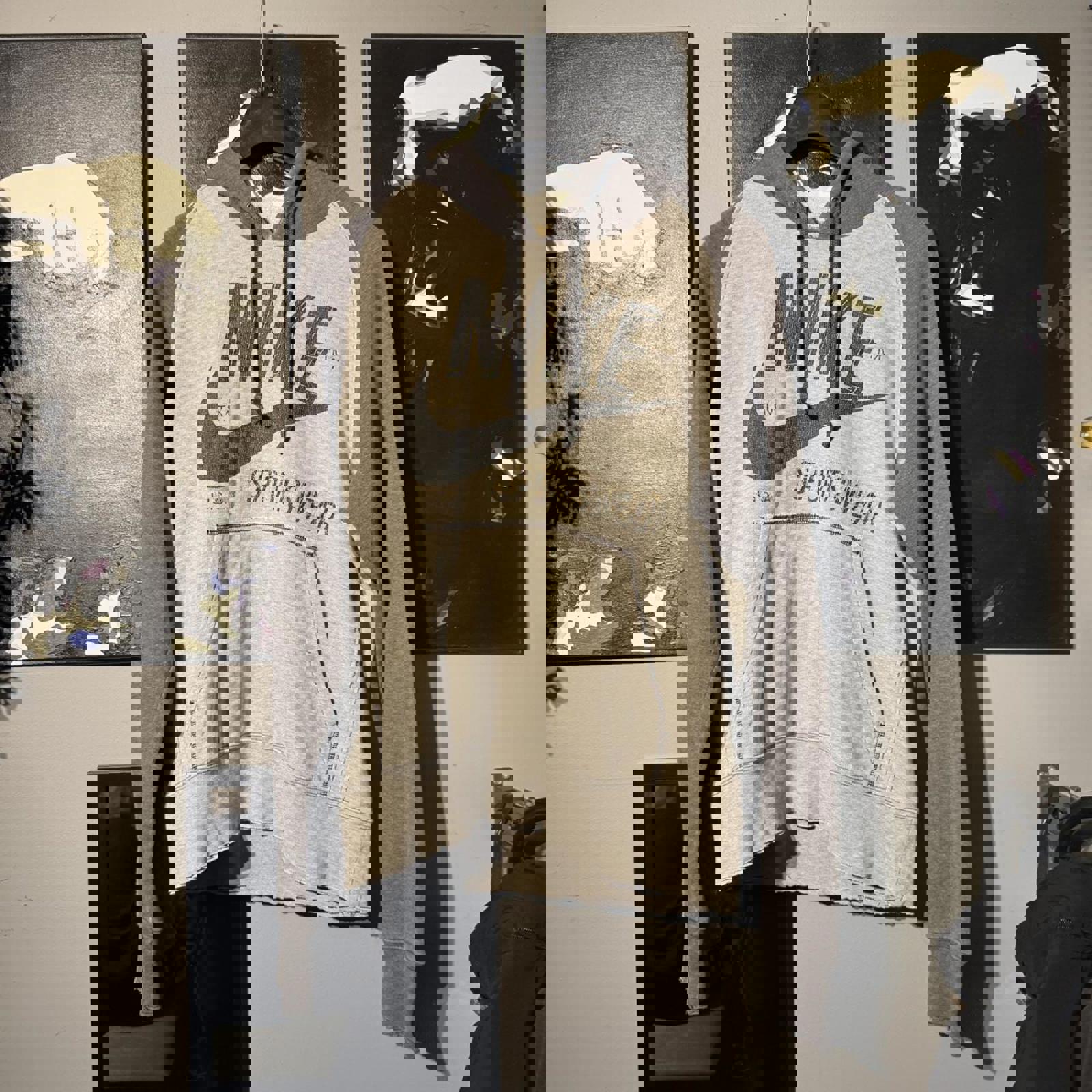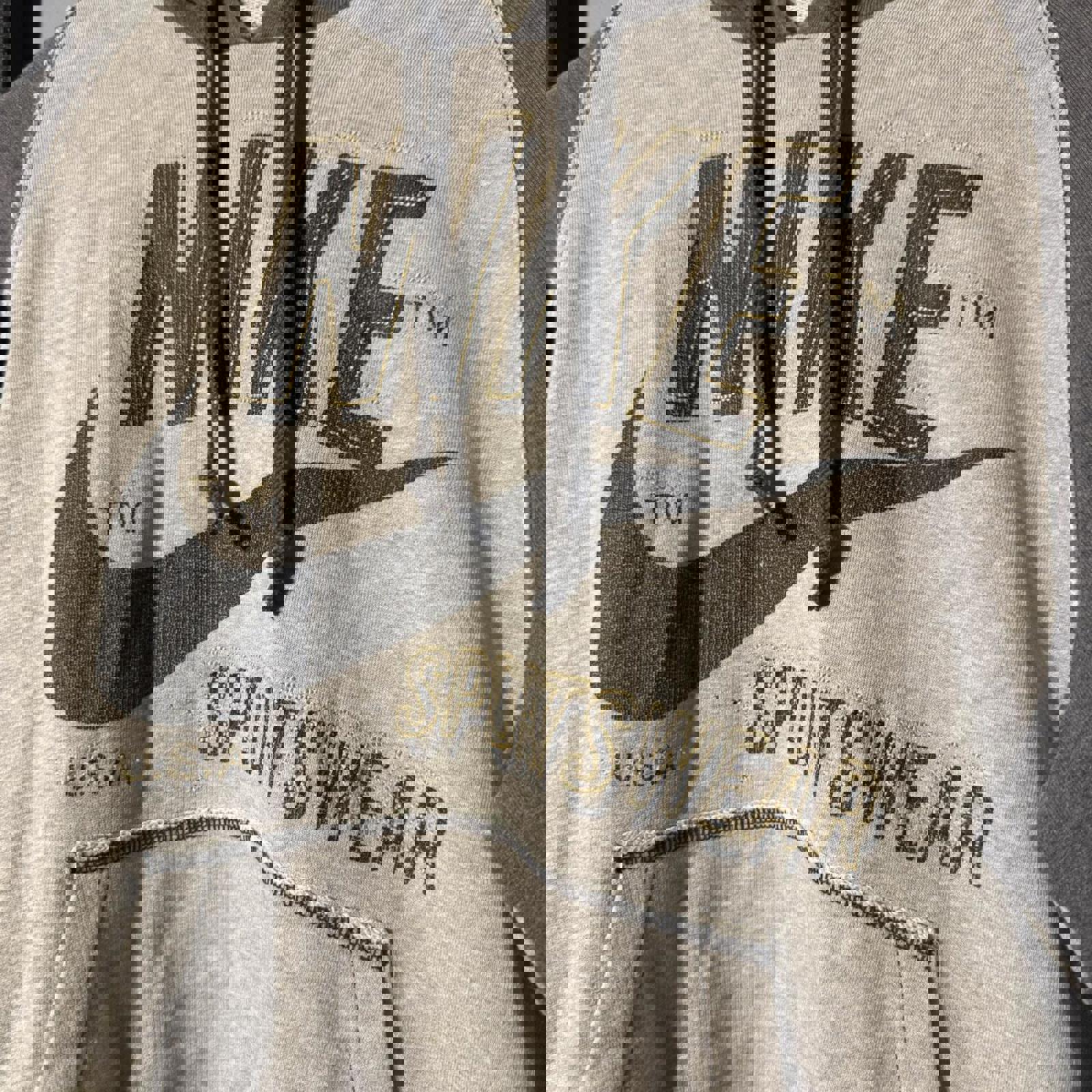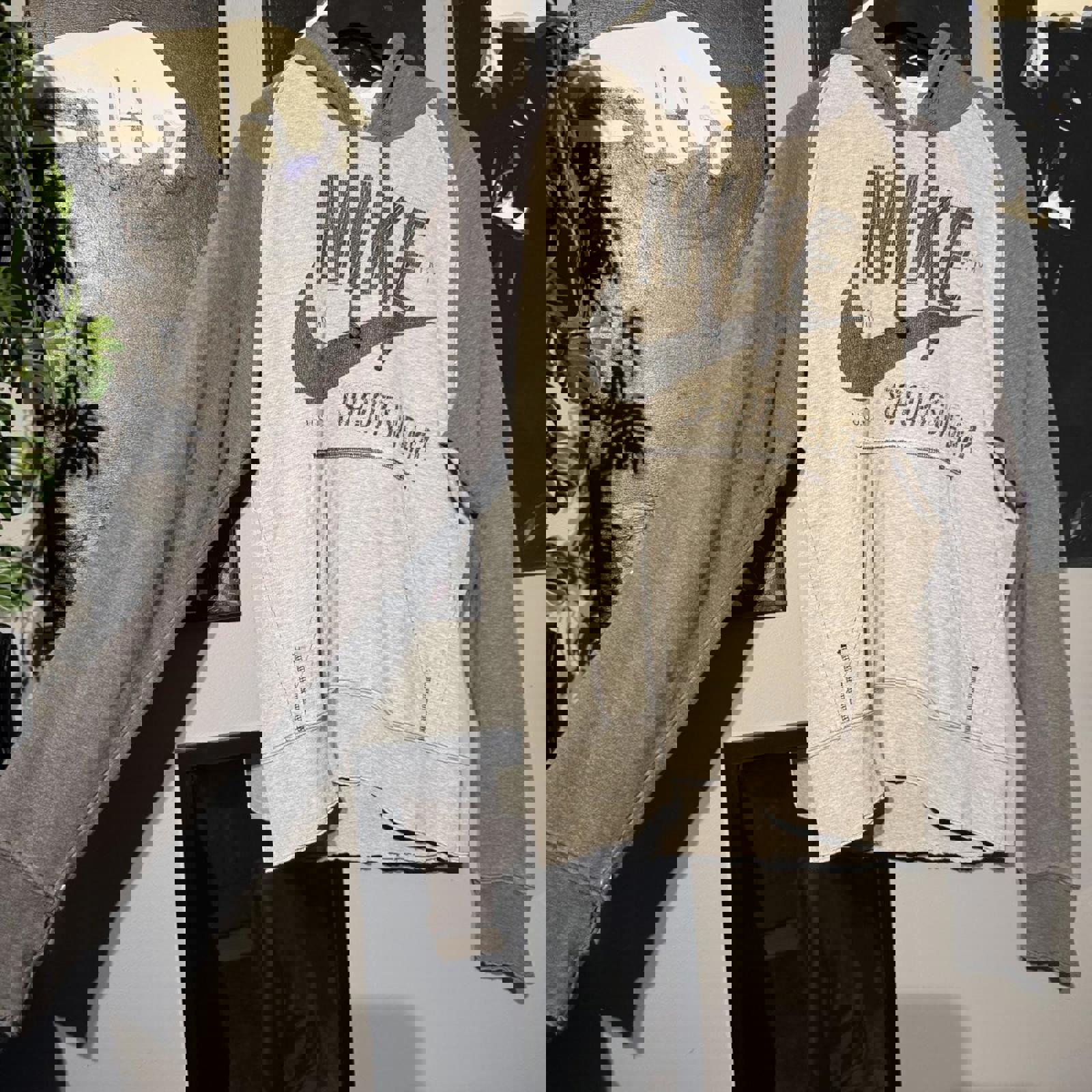 ▪️ Additional info: Two-tone grey Nike Sportswear hoodie with large distressed front print. Raglan sleeve design, kangaroo pocket, and vintage-style stitched branding. Soft fleece interior with raw hem and sleeve edges